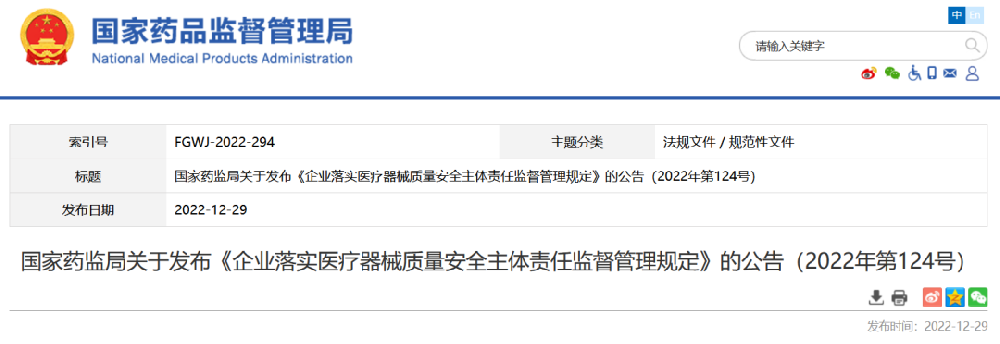 2023-02-102022年12月29日,國家藥品監(jiān)督管理局發(fā)布《企業(yè)落實醫(yī)療器械質(zhì)量安全主體責(zé)任...